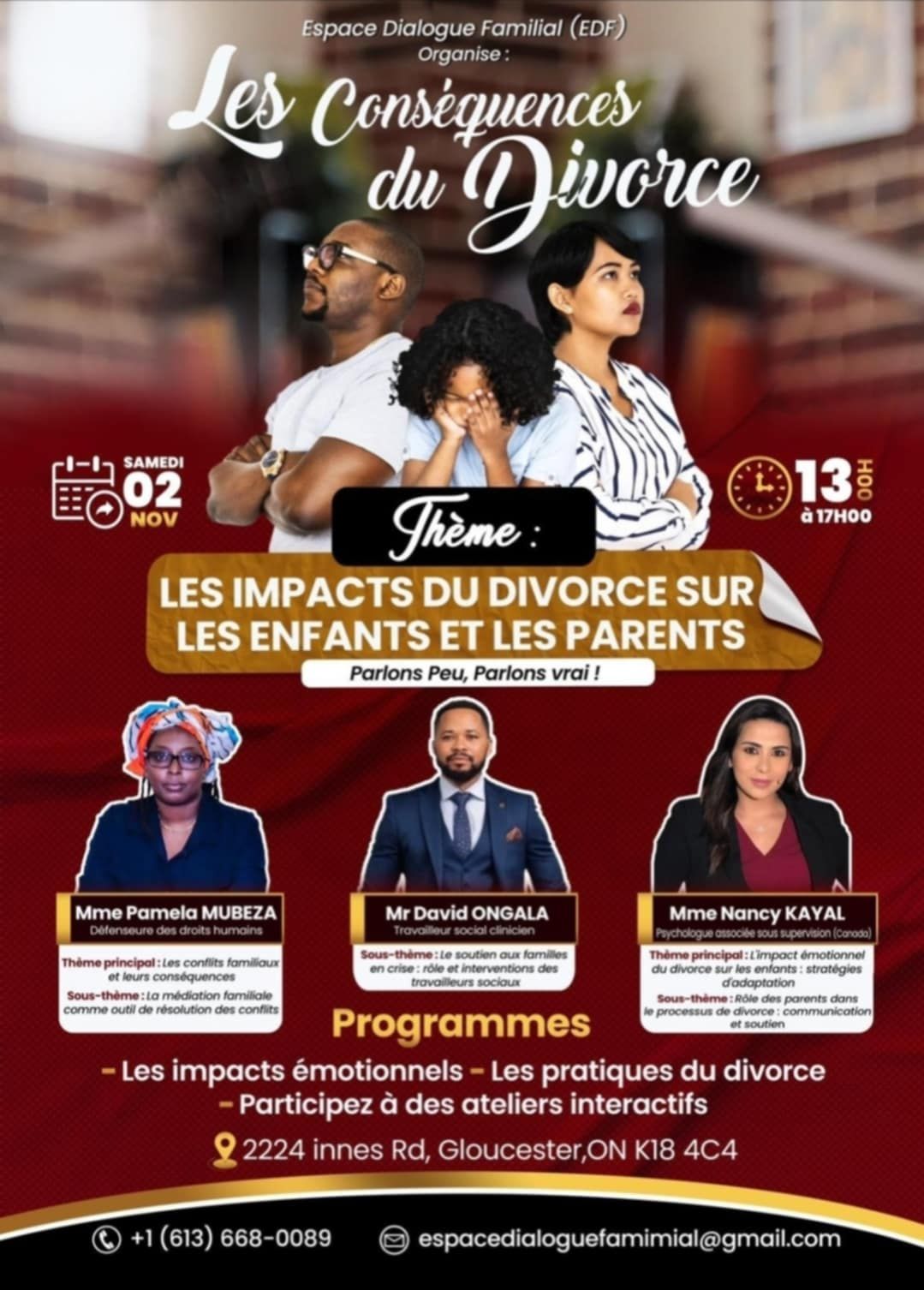 Dans le cadre de sa mission de sensibilisation et de soutien aux familles, Espace Dialogue Familial a organisé, via son projet Parlons Peu, Parlons Vrai ! (P³V), un forum de discussion essentiel et délicat portant sur les impacts du divorce sur les enfants et les parents. Cet événement a permis un échange riche et une réflexion approfondie grâce à la participation de trois panélistes experts dans des domaines complémentaires liés au bien-être familial, à la santé mentale et aux droits humains.